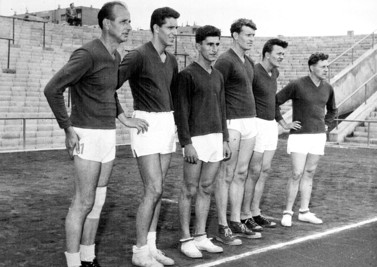 Poslední snímek je z první poloviny 60. let a turnaje veteránů na stadionu Karla Aksamita v Holešovicích, vybudovaného a otevřeného u příležitosti ME 1958. Internacionál Václav Raban (první zleva) na něm startoval s družstvem Spartaku Avia Čakovice, se kterým hrál II. ligu v letech 1957 - 1958 a který pod jeho vedením postoupil v roce 1958 do nejvyšší soutěže. Zleva stojí Raban, Hamták, Krippner, Majer, Bican a další internacionál Miloš Bouchal (stříbrný z MS 1949 v Praze a spoluhráč V.Rabana v ligové Spartě).