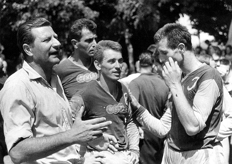 V roce 1963 získala Dukla Kolín svůj třetí mistrovský titul až po závěrečném duelu a vítězství 3:2 se Slavii VŠ Praha. Na záběru z oddechového času je zleva trenér Jaroslav Fučík s hráči Tesařem, Smolkou a Felklem .