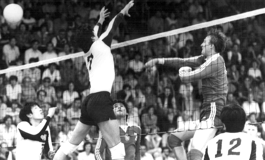 Další dva snímky jsou z utkání Světového poháru 1985 mezi ČSSR a Jižní Koreou. Na prvním nahrávač Strumienský sleduje rychlý útok Bláhy středem sítě proti jednobloku soupeře, na druhém zpracování míče Korejci sledují Strumienský (č. 2) s Prieložným.