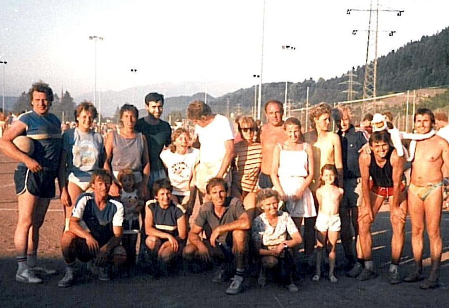 Na volejbal manželé Švarcovi nezanevřeli ani po své emigraci do SRN v roce 1984 a využili každé možnosti zahrát si s dalšími volejbalovými emigranty. Snímek je z roku 1985 a z turnaje mixů (čtyři + dvě) v Salzburku. V horní řadě zleva stojí Josef Švarc, Katka Švarcová, Marcela Janoušková, Ivan Třešňák, Barbara a Martin Hanzálkovi a předposlední v předklonu Pavel Třešňák. Dole zleva Tonda Houska, Stáňa Švarcová a Ota Bernad.