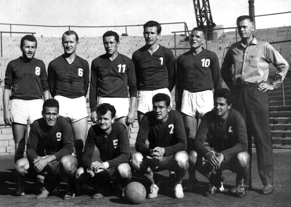 Mistři Evropy 1955 v Bukurešti v době volna na amatérské fotce již neznámého autora. Horní řada zleva Jonáš, Purnoch, Malý a Tesař, uprostřed zleva Synovec, K. Brož, Musil, Paldus a Humhal, dole zleva Schwarzkopf, Láznička a Paulus.