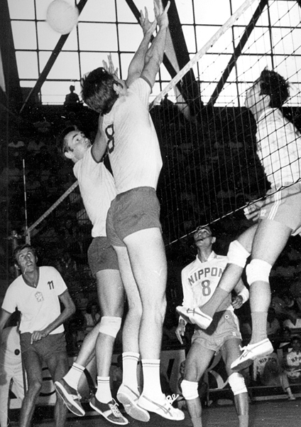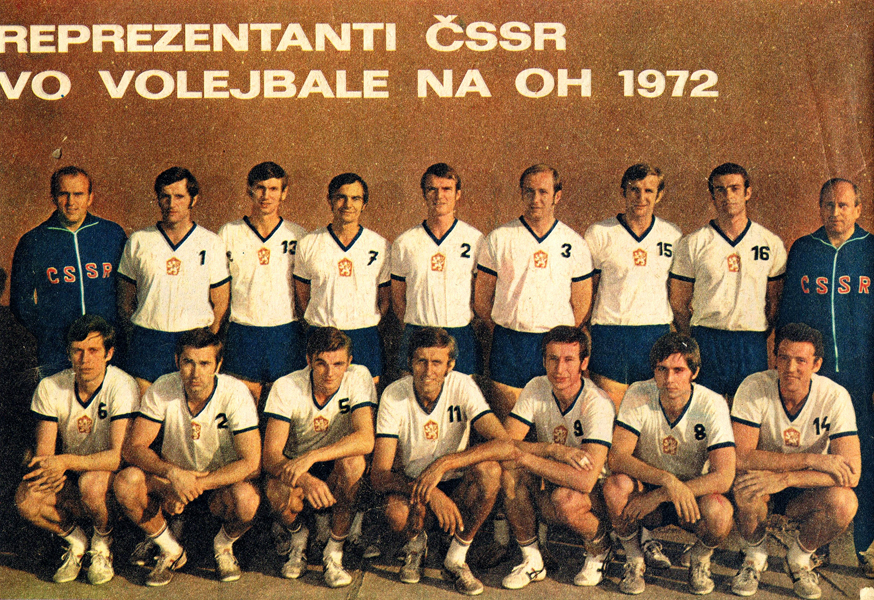 Muži ČSSR absolvovali v roce 1971 sérií utkání s družstvem Japonska, v srpnu na domácí půdě, v říjnu v Japonsku. Na snímku z haly Sparty na Letné zleva: kapitán Groessl, Zajíček, Nekola, Fiala, Němec, Pavlík, Stančo, Pipa, Tomáš (č. 8), Vápenka, Schenk, Koudelka, Penc a Petlák. Pod vedením trenéra Lázničky přivezla tato sestava (s výjimkou Fialy a Pence) stříbrné medaile z ME 1971 v Itálii.