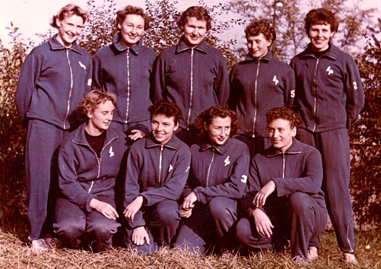Po úspěchu v Bukurešti se „až“ 4. místo našich volejbalistek na MS 1956 v Paříži stalo zklamáním nejen pro naši volejbalovou veřejnost, ale i pro hráčky samotné. O jednu z medailí je připravily prohry se Sovětkami (tentokrát hladce 0:3), s Rumunkami a Polkami (shodně 2:3 po boji). Na snímku zleva stojí držitelky „bramborových“ medailí (co bychom za ně dnes dali?): Štaudová, Holá, Nečasová, Kučerová, Svozilová a Valášková, dole zleva Neugebauerová, Štulcová, Moravcová, Šindelářová, Lútočková a Matalíková, trenérem stále M. Mácha.