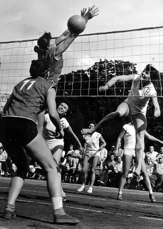 Na dalším (akčním) snímku překonává „Bobina“ Halásková (č. 9) blok jedné z rumunských hráček při mezinárodním utkání Brno-Bukurešť (2:3), sehraném 6. srpna 1956 v Brně.