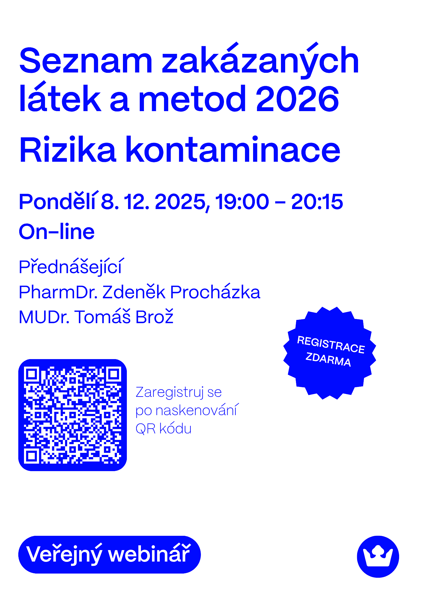 Antidopingový výbor ČR vás zve na poslední antidopingový webinář tohoto roku s názvem Seznam zakázaných látek a metod 2026, Rizika kontaminace, který se zaměří na klíčové změny a aktuální témata v oblasti antidopingu. Webinář společně povedou MUDr. Tomáš Brož a PharmDr. Zdeněk Procházka, členové Komise pro terapeutické výjimky a lektoři ADV ČR. Webinář se uskuteční v pondělí 8. prosince 2025 od 19:00 do 20:15 a je určen nejen sportovcům a jejich doprovodnému personálu, ale i široké sportovní veřejnosti.