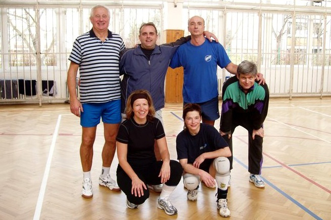 Parta volejbalistů, která pod názvem Žižkov vyhrála v roce 2013 kategorii veteránů (+40 let) turnaje v Dřevěnici. Na nočním snímku před „Štítem vítězů“ stojí zleva Hec, Zdeněk a Tomáš Míkovi, M. Kop, Dvořák a Zita, v podřepu zleva Elišák, Pokorný, Cihlář a Brátka.