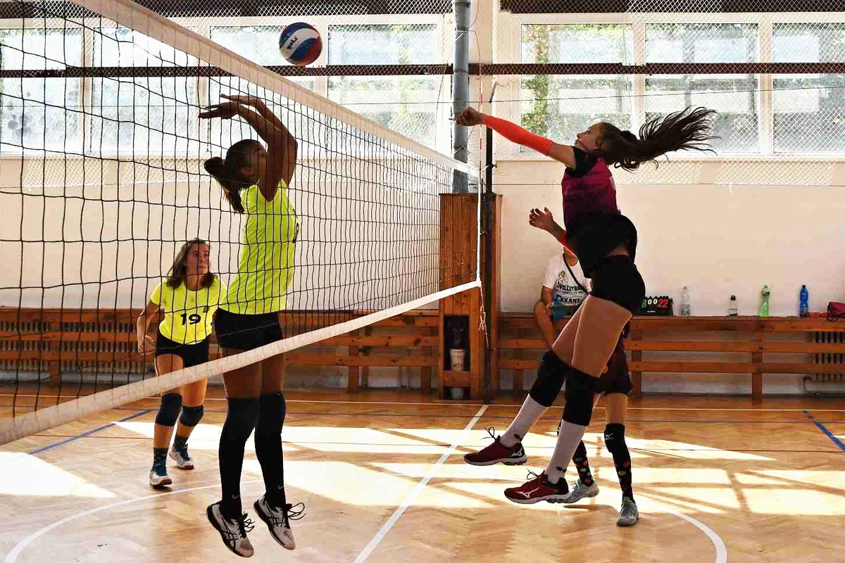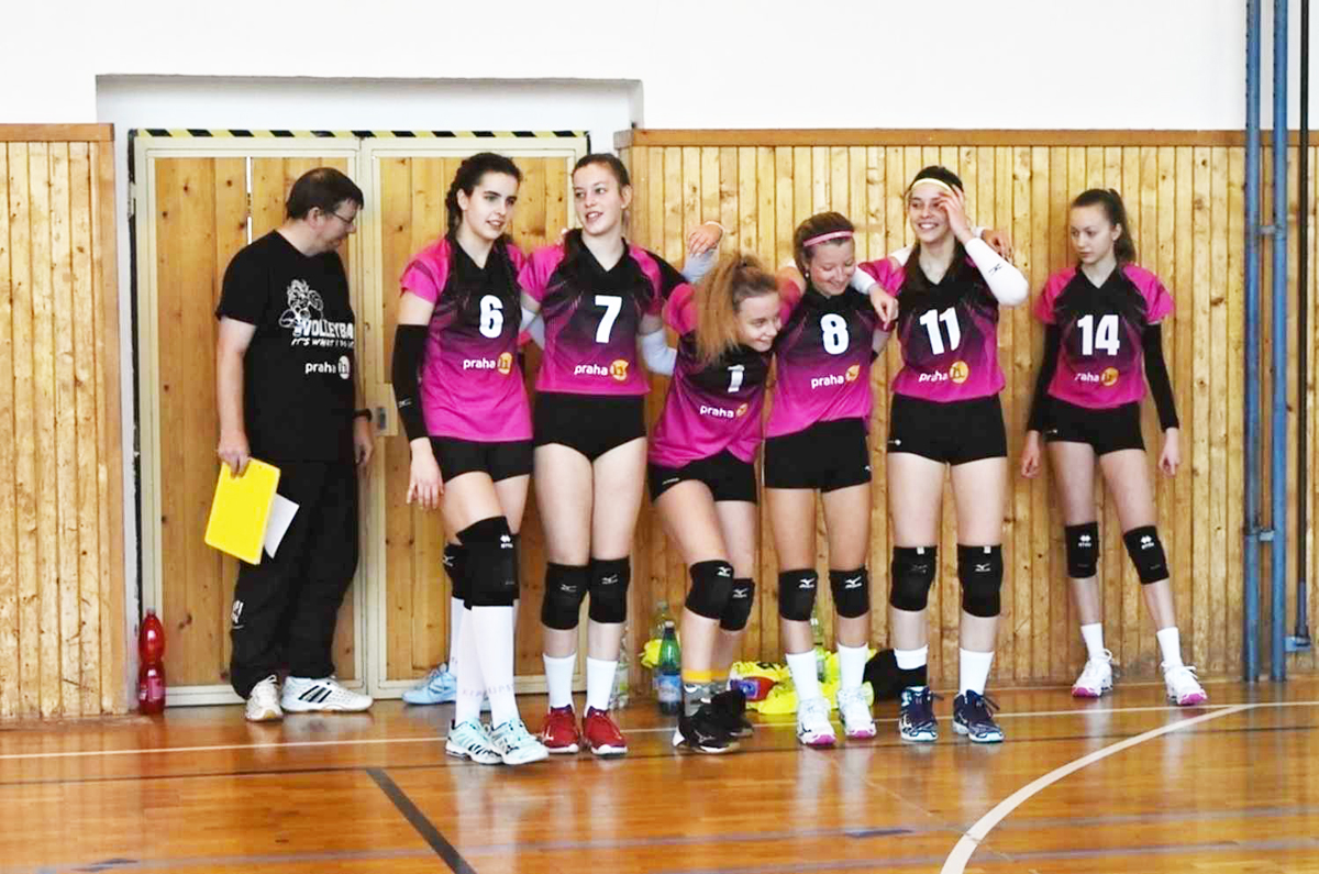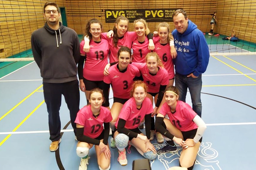 Na prvním vloženém snímku starší žákyně ZŠ Mikulova v roce 2019, u dveří trenér Martin Lepič, s č. 7 Markéta.