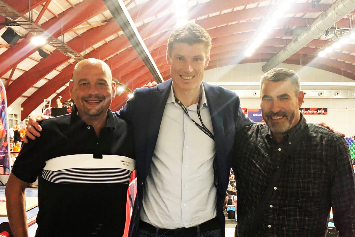 Další snímek vznikl při ME mužů 2019 v Belgii a Nizozemsku a Tomáš (nalevo) se na něm nechal vyfotografovat s legendou nizozemského volejbalu, 212 cm vysokým blokařem Bas Van de Goorem (mj. olympijským vítězem z Atlanty 1996) a s Radkem Hacaperkou - v současnosti členem správní rady ČVS a bývalým spoluhráčem v Laktosu Kyje.