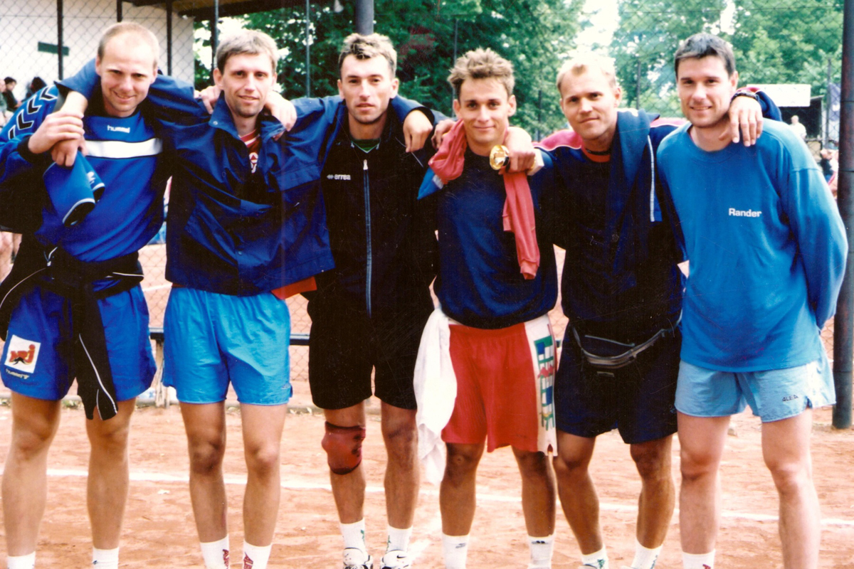 Na druhém snímku Čtveráci při finálovém turnaji Antukové ligy v roce 2000 v Hodslavicích. Zleva Martin Demar, Jiří Rejman (volejbalový komentátor ČT), Milan Hadrava, Zdeněk Pommer, Pavel Holčík a Michal Nekola.