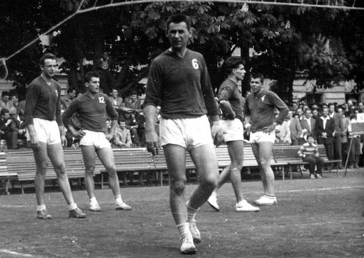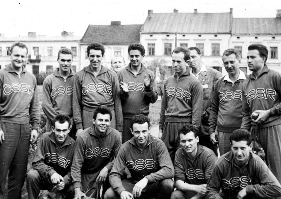 Po vojně v RH Cheb se Jirka vrátil na Starý Ostrov a na dalším snímku je pětice hráčů Dynama při ligovém utkání v Bratislavě v roce 1959. Zleva hráči Dynama Praha Červinka (1), Hálek (12), internacionál Zdeněk Soukup (6), Hamáček a Ebert (4).