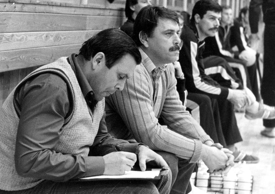 Po hráčských aktivitách ve Spartě a Tatře Smíchov, kde začal Jirka působit již v roli hrajícího trenéra s kvalifikací 2. třídy, přijal v roce 1979 nabídku Zdeňka Pommera a stal se jeho asistentem u extraligových mužů RH Praha. Na snímku z liberecké haly a počátků této spolupráce nalevo asistent trenéra a současně statistik „Dynda“ (Jirka Ebert), napravo trenér a kouč „Pompe“ (Zdeněk Pommer), za nimi na lavičce Tomáš Sýkora s dalšími střídači.