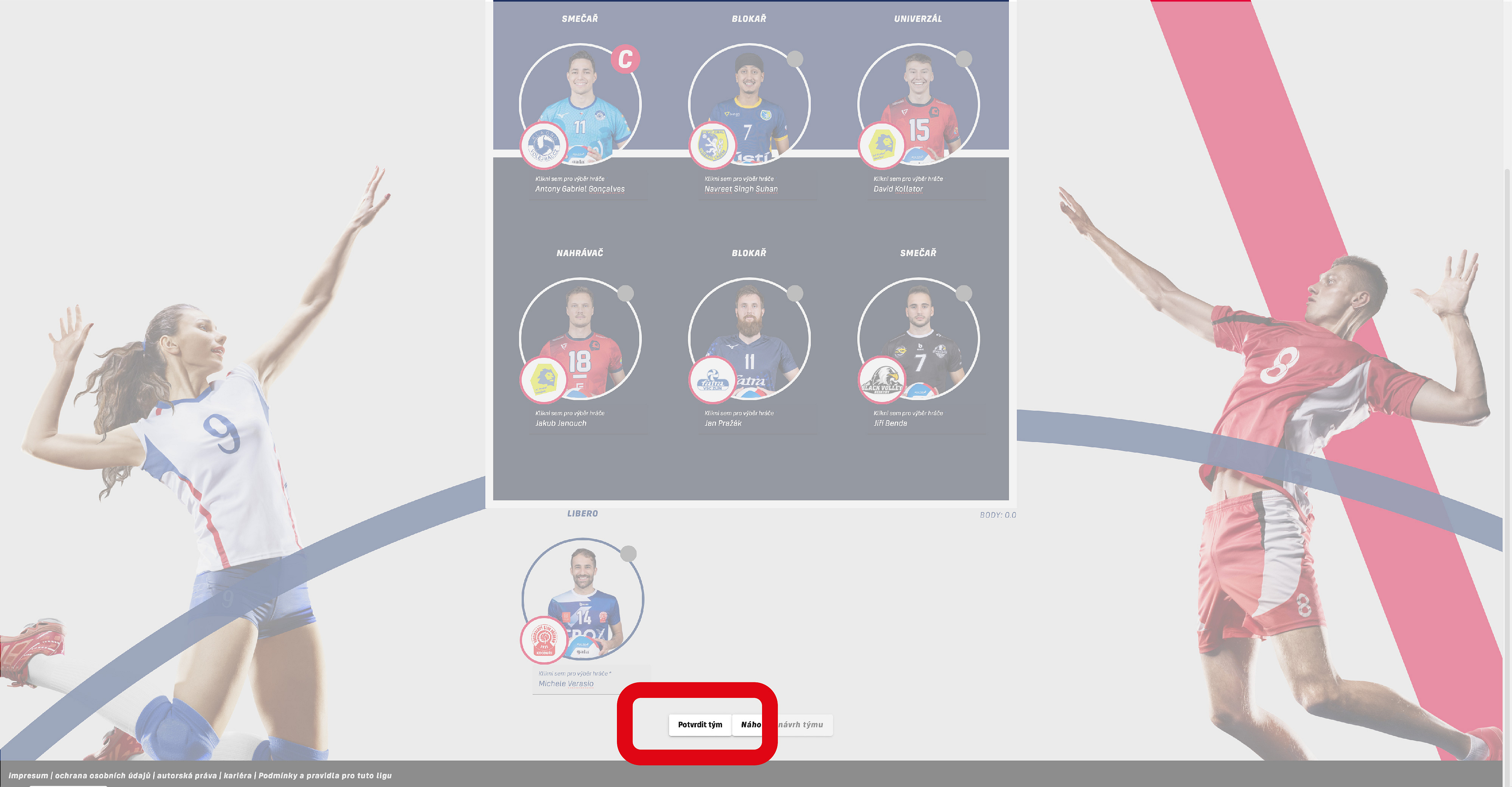 Nakonec stačí svůj výběr potvrdit a jste ve hře. Pozor, nezapomeňte označit kapitána (šedé kolečko vpravo u každého hráče), ten bere o 20% bodů více.