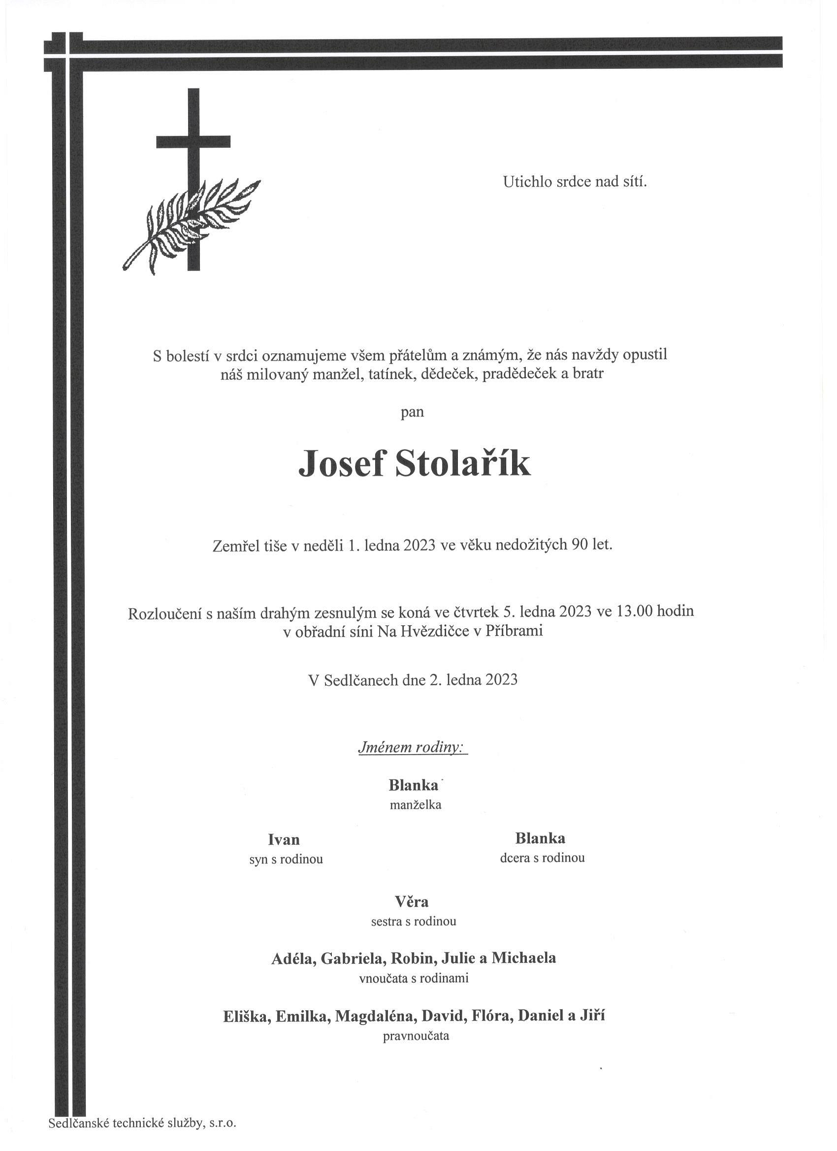 Ve věku nedožitých 90 let nás opustil Josef Stolařík. Poslední rozloučení s Josefem bude ve čtvrtek 5. ledna 2023 ve 13:00 hodin v obřadní síni Na Hvězdičce v Příbrami. Parte.