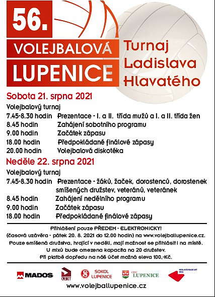 „V sobotu bude patřit Lupenice kategorii mužů a žen, a to I. a II. třídy. V neděli pak přivítáme mládežnická družstva, veterány a smíšená družstva,“ říká starosta Lupenice David Čižinský. Není tajemstvím, že tento turnaj je oblíbenou zastávkou extraligových týmů v jejich letní přípravě. „Máme nyní přihlášeno celkem 22 týmů a z extraligy vím, že přejedou VK Ostrava, Volley Beskydy. Ze zahraničí se k nám chystá VKP Bratislava a Sokol Vídeň,“ dodává Čižinský.