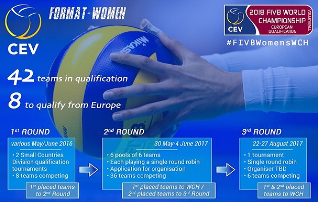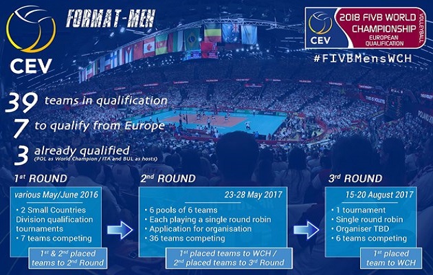 Správní rada CEVu dnes na svém zasedání představila schéma kvalifikace na světový šampionát v roce 2018. Evropský kvalifikační cyklus bude mít u mužské i ženské části tři kola - předkvalifikaci, hlavní a závěrečnou kvalifikaci. V hlavní části se představí v šesti skupinách celkem šestatřicet týmů. V Evropě se bude v mužské části bojovat o celkem sedm postupových míst, v ženské části pak o míst osm. Zajištěnou účast mají již jistou dosavadní světoví šampióni z Polska a také pořadatelské země, tedy Bulharsko a Itálie.
