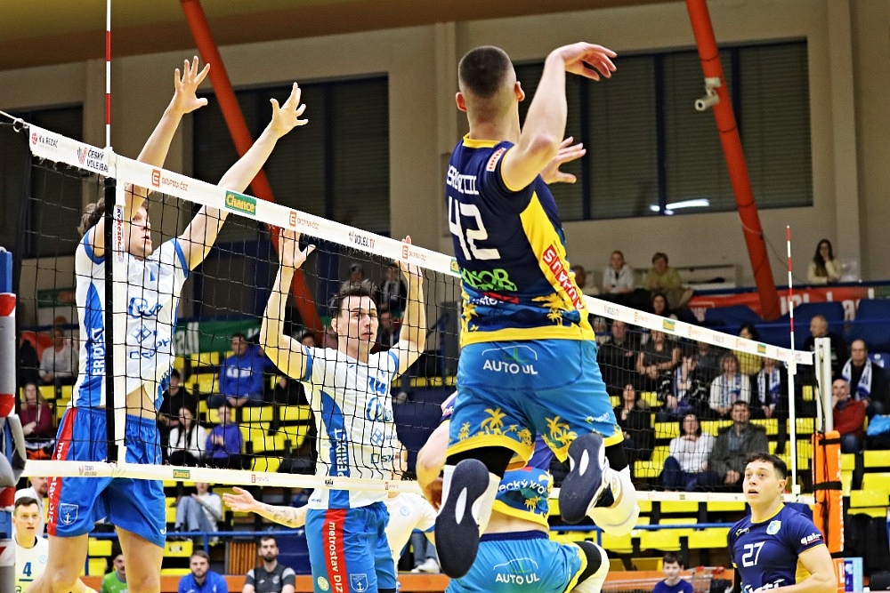 V napínavém volejbalovém duelu se dnes střetly dva týmy, které se mohly pochlubit novými tvářemi na své soupisce. SKV Ústí nad Labem přivítalo na palubovce svou novou posilu, srbského smečaře Nemanju Peruničice, který má za úkol posílit herní dynamiku týmu. Na druhé straně AERO Odolena Voda mohlo už v druhém utkání představit francouzského smečaře Pierra Derouillona. Do prvního setu vstoupily oba týmy s nadšením. Stav je zatím velice vyrovnaný, na obou stranách jsou vidět nevynucené chyby. O důležitý bod se postaral Ivo Hulpach, který svým servisem zajistil eso a servis si zopakuje. Bohužel se ale hosté ujímají malého náskoku a domácí trenér si vybírá svůj první oddechový čas. A za stavu 13:8 pro hosty přichází i střídaní na domácí straně, do hry nastupuje po zranění Matouš Lank. Domácí se nevzdávají a konečně přichází zajímavé zákroky, Ústí snižuje na 12:16 a trenér hostů Matyáš Démar si bere svůj první oddechová čas. Po oddechovém čase se o další bod postarala domácí posila Nemanju Peruničič, který dal přímý bod ze servisu a ihned poté skvělý zákrok Matouše Lanka dodal energii pro Ústí. Za stavu 21:17 pro Aero si bere Ondřej Žaba svůj druhý oddechový čas, aby se jeho svěřenci uklidnili. Aero nedělá takové chyby a svůj náskok si stále drží. Pierra Derouillon se v prvním setu ukázal jako skvělá posila na straně hostů. Za vedení 24:22 žádá trenér Matyáš Démar svůj druhý oddechový čas. Bohužel domácí celek koncovku neotočil a Aero vyhrává první set 25:22.
