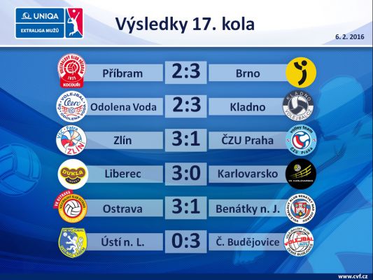 Ve šlágru 17. kola nejvyšší české volejbalové soutěže UNIQA extraligy přivítala domácí Příbram silné Brno, které nedávno navíc angažovalo novou ruskou posilu Sergeie Andrianova. Domácí dnes první dva sety zaostávali na servisu i na příjmu, stav byl velmi rychle 2:0 pro Brno. Domácí Kocouři se ale nevzdali a zdálo se, že by se po dvou vyhraných setech v jejich prospěch ještě mohli nadechnout k závěrečnému obratu. V rozhodujícím pátém setu však Brno nedalo Příbrami šanci a odváží si domů důležité 2 body, kterými pojišťuje průběžné čtvrté místo v tabulce. Příbram díky jednomu bodu udrží průběžné páté místo, byť však už s propastným odstupem devíti bodů.