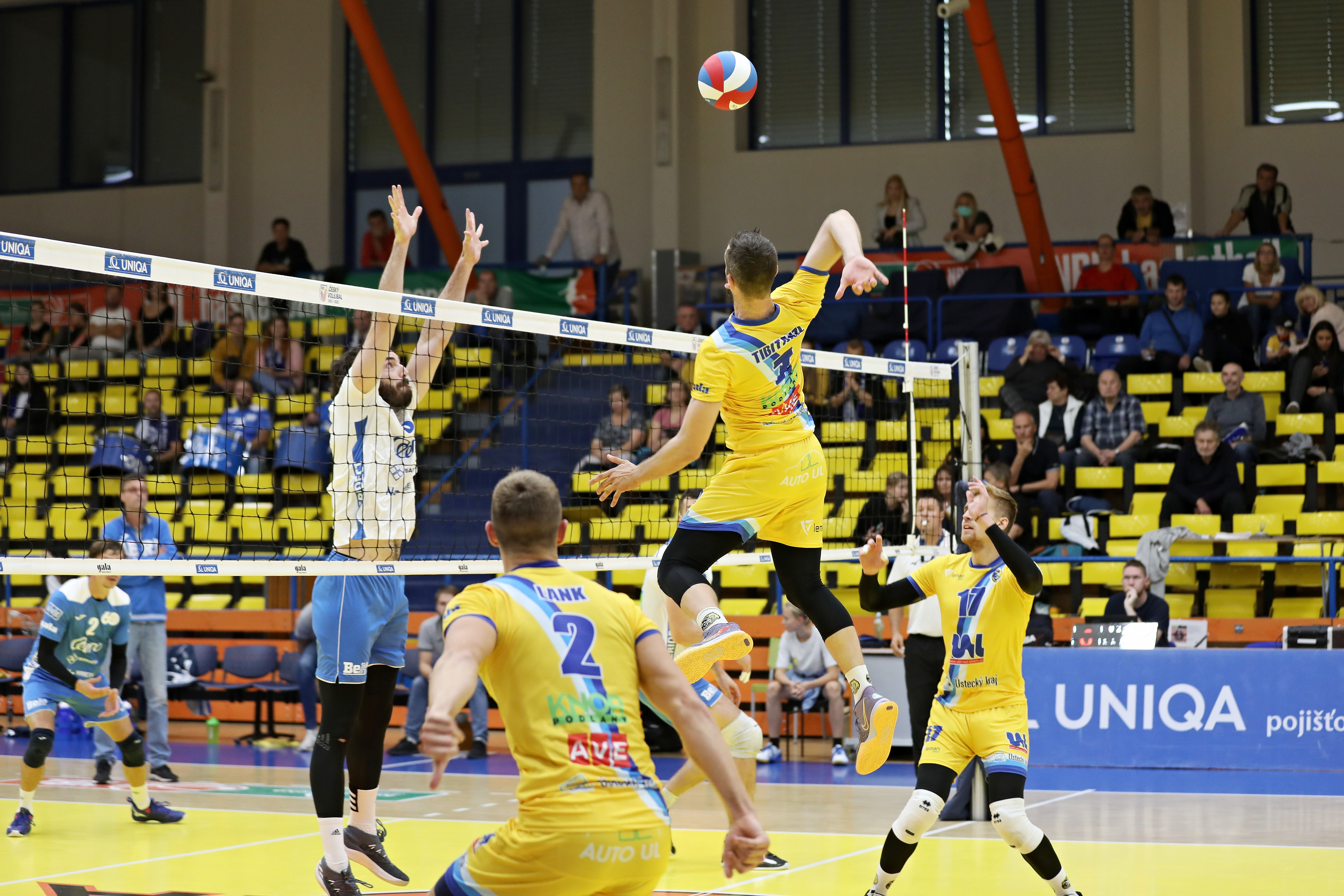 Jasnou představu o hře Brna měl před duelem trenér domácích Tomáš Pomr. „Jeho styl je založený na výborném servisu, mladíky budou řídit zkušení Zmrhal s Hrazdirou,“ uvedl. Přesně takto se Moravané v UNYP Areně prezentovali. Při podání Hrazdiry se dostali do vedení 8:5, při servisu Zmrhala přidali další bodík náskoku – 12:8. Junior Drahoňovský chtěl napodobit své ostřílenější kolegy, po jeho dvou esech to bylo 16:11 pro Brno. Kouč Pomr neváhal, vzal si oddechový čas. To krátkodobě pomohlo, do koncovky se šlo za stavu 19:20. V ní ovšem opět řádil Hrazdíra, jenž chladnokrevně uhrál dva klíčové balony – 22:25.