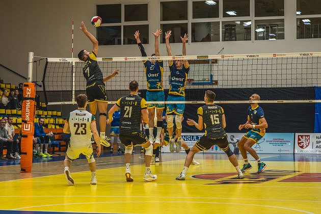 Začátek první setu středečního zápasu začal velmi vyrovnaně. Oba týmy se dopustily několika chyb na servise a tahaly se bod po bodu. Brno se ale po chybě na útoku domácích dostalo do vedení 7:6. A dvoubodové vedení si drželo do první oddechové času, který si vzal trenér domácích Ondřej Žaba. Po oddechovém času šel na servis Wellington Bolzani a Ústí srovnalo na 10:10. Nerozhodný stav byl i po dlouhé výměně, ve které exceloval v poli domácí Kanaďan Jérémie Murray. Za stavu 13:14 šel na servis Matouš Lank, který si připsal přímý bod z podání a srovnal stav. Ale i na straně Volejbalu Brno se připisují body z podání, a to od Jana Pražáka, který pro svůj tým zajistil opět dvoubodový náskok. Za vyrovnaného stavu 19:19 si vybírá time trenér hostů Ondřej Marek. Přichází napínavá koncovka, ve které si za stavu 22:22 vybírá domácí trenér svůj druhý oddechový čas. První set končí nakonec stavem 26:24 pro Ústí.