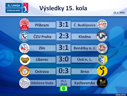 Ve šlágru 15. kola nejvyšší české volejbalové soutěže UNIQA extraligy přivítala domácí Příbram dosavadního lídra tabulky VK Jihostroj České Budějovice, který podobně jako Liberec bude mít v této soutěži nejvyšší ambice. Domácí dnes ale předvedli kompaktní, bojovný výkon, a po čtyřech setech, z nichž tři byly vyrovnané, si překvapivě České Budějovice neodváží z Příbrami ani bod, a jejich pronásledovatel Liberec vítězstvím v Ústí nad Labem stahuje náskok v tabulce na pouhý jeden bod.