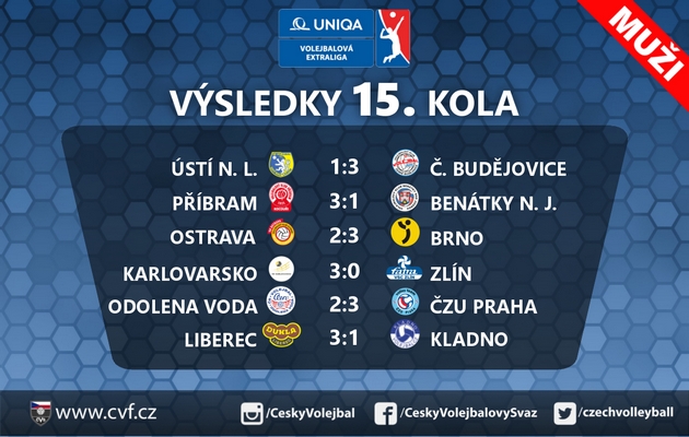 Kompletním patnáctým kolem dnes pokračovala české UNIQA extraliga. Šlágr kola ovládl mistrovský Liberec, který porazil vedoucí Kladno ve čtyřech setech. Dařilo se také Příbrami, jenž zdolala Benátky 3:1 na sety a je už na čtvrtém místě tabulky, navíc se stejným bodovým ziskem jako třetí Dukla. Tabulku nadále vede s přehledem duo Kladno - Karlovarsko. A právě Karlovarsko si připsalo jediné dnešní třísetové vítězství, když zdolalo zlínskou Fatru Dařilo se také Budějovicím, Brnu a pražskému ČZU.