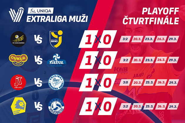 V pondělí jsou na pořadu druhé čtvrtfinálové zápasy UNIQA volejbalové extraligy mužů 2022/23. Již první zápasy, které se odehrály na palubovkách lépe umístěných týmů v základní části, ukázaly, že dopředu nemá nikdo nic jasné. Favorité se trápili s nervozitou a možná i s herní pauzou. Je velmi pravděpodobné, že právě pondělní zápasy hodně napoví o tom, kdo se podívá do semifinále.