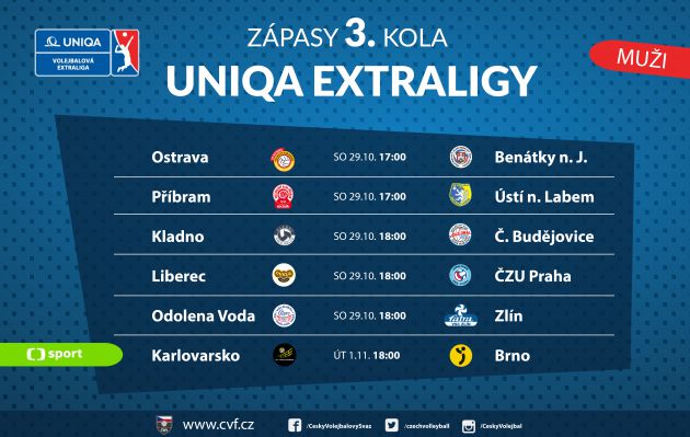 Pěti zápasy třetího kola pokračuje dnes mužská UNIQA extraliga. Šlágrem hlavního hracího dne je souboj ambiciózního Kladna s Českými Buděovicemi, vyrovnané souboje se očekávají i v Ostravě, kam zavítají Benátky, a v Odolene Vodě, která bude hostit zlínskou Fatru. Mistrovská Dukla Liberec chce zase odčinit překvapivou porážku ze Zlína, kde minulý týden prohrála v pěti setech, a dnes od 18 hodin hostí pražské ČZU. Poslední duel bude dnes na programu v Příbrami, kde místní Kocouři v prvním domácím utkání nové sezóny změří síly s posíleným Ústím. Hezkou sobotu s tuzemským volejbalem!