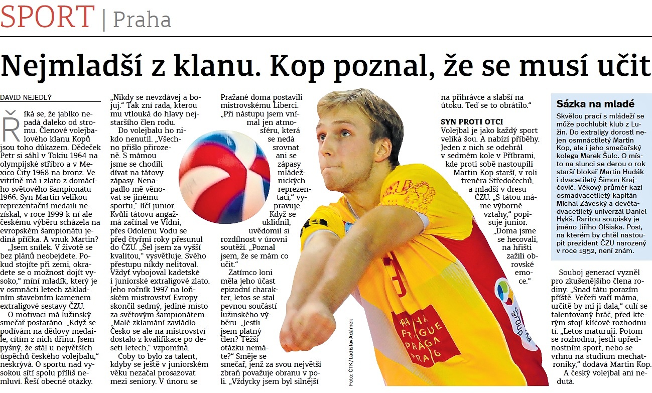 Jméno Kop je na tuzemské i mezinárodní scéně pojem. Výraznou stopu do volejbalového světa udělali jeho dědeček i otec. Nyní na ně chce navázat i on sám. Řeč je o talentovaném smečaři volleyteam ČZU Praha Martinu Kopovi. Rozhovor z úterního Pražského deníku si můžete přečíst ZDE.