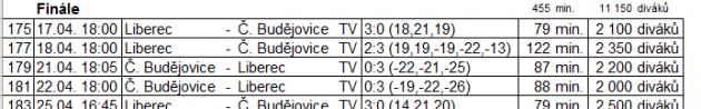 Co se týče divácké statistiky posledních finálových zápasů, tak i ta je velmi zajímavá. Všechna loňská finále, ve kterých se představili volejbalisté Dukly Liberec a českobudějovického Jihostroje, vždy sledovaly minimálně dva tisíce diváků. Rekord drží závěrečný pátý zápas této série, který navštívilo celkem 2.500 platících diváků. Pět finálových duelů pak celkem sledovalo 11.150 platících diváků. Jaké divácký zájem vyvolá letošní série mezi Libercem a Brnem?