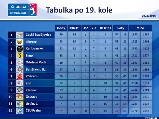V sobotu 20.února je na programu celkem pět zápasů nejvyšší české mužské soutěže UNIQA extraligy. Do konce základní části zbývají již jen tři kola a stále není ještě jasné, kdo bude vítězem základní části, ani kdo postoupí do elitní osmičky a tedy do vyřazovacích bojů play off. Pro fanoušky bude v sobotu jistě atraktivní podívanou duel třetího Karlovarska a čtvrtého Brna, které je na programu v karlovarské Hale míčových sportů od 18 hodin. Ve stejný čas začne i jeden z klíčových duelů o účast v play off mezi Kladnem a Příbramí.