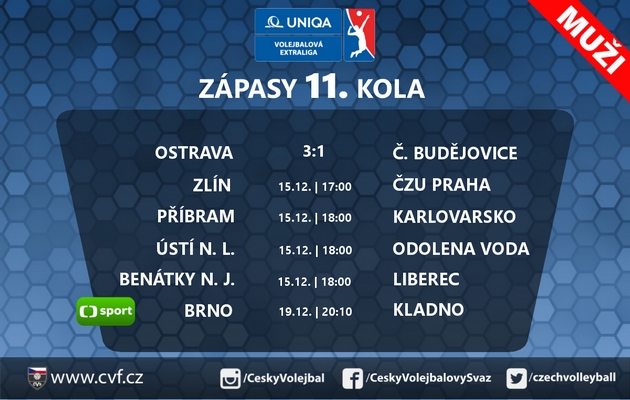 Netradičně ve čtvrtek 15. prosince jsou na programu čtyři zápasy jedenáctého kola mužské UNIQA extraligy. Osmá Fatra Zlín vyzve od 17 hodin pražské ČZU, o hodinu později pak Benátky přivítají Liberec, Příbram rozjeté Karlovarsko a poslední Ústí nad Labem na hraně postupu do play off balancující Odolenou Vodu. Jedenácté kolo pak doplní pondělní televizní dohrávka mezi Brnem a Kladnem.