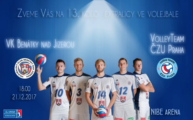 Dnes pokračuje 13. kolo UNIQA volejbalové extraligy mužů 2017/18. Benátky nad Jizerou se již potřetí za sebou představí domácímu publiku, tentokrát v boji o důležité body vyzvou ČZU Praha. V minulém kole volejbalisté Benátek svou předvedenou hrou zaskočili Ostravu a téměř sahali po bodech. Pokud budou pokračovat ve zlepšeném výkonu a zvládnou „hlavu“ v koncovkách setů, mohou myslet i na vítězství. I tým z Prahy se bude rvát o výhru a bude se snažit vyvarovat nevynucených chyb, pramenících z jejich mladí a menší zkušenosti. Proto se dá předpokládat vyrovnané utkání. Kdo si udělá v posledním svém extraligovém zápase letošního roku větší radost???
