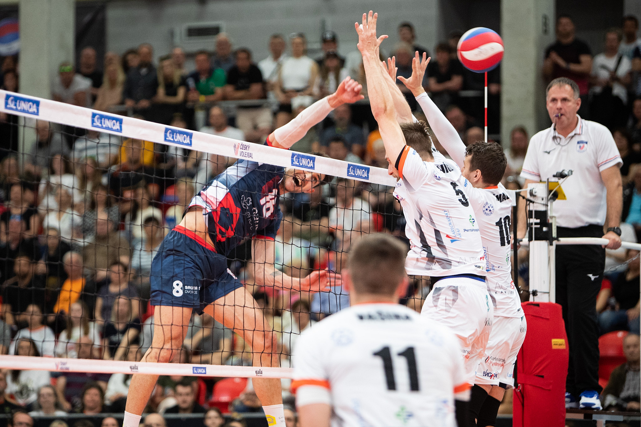 Karlovarsko ve třetím setu vede po sérii Indry na podání 12:9. Nizozemský nahrávač Keemink dává eso (16:11), na straně Lvů se daří ztrátovat australskému smečaři Smithovi, ale následně je zastaven trojblokem Vašina, Zajíček a Indra (17:12). Wiese vybral ránu od van Dijka a Keemink posílá nahrávku Indrovi, který připisuje devatenáctý bod. Karlovarsko jde do koncovky ve vedení 22:14 a na servis přichází Indra, ale ze středu sítě se vyvěsil neomylný Nedeljković (22:15). Stejnou mincí oplácí Keemink s Wilsonem a Wiese zařizuje setbol esem (24:15). Kriško a van Dijk svými útoky ještě odmítají konec třetího setu (24:17). Poté Kriško posílá své podání do sítě a tím i Karlovarsko do vedení 2:1 na sety.