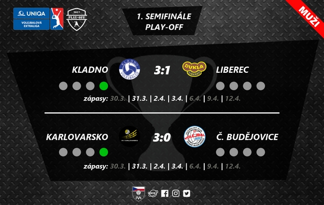 Prvními zápasy semifinále play off dnes pokračovala nejvyšší česká soutěž UNIQA extraliga. Z vítězství v úvodních zápasech se radovali volejbalisté Kladna, jenž zdolali mistrovský Liberec 3:1 na sety, i druhý tým základní části - ČEZ Karlovarsko. To udolalo ve třech setech českobudějovický Jihostoj. Hrály se i dva duely skupiny play out, v nich zvítězilo ČZU Praha nad Ústím nad Labem i Zlín nad Benátkami.