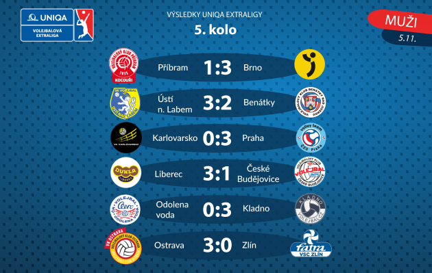 Kompletním pátým kolem pokračovala v sobotu mužská UNIQA extraliga. Velké překvapení se odehrálo v Karlových Varech, kde domácí ČEZ Karlovarsko ve třech setech podlehlo pražskému ČZU. Ve šlágru kola pak zvítězila na severu Čech Dukla Liberec, která 3:1 na sety zdolala České Budějovice. Připravujeme podrobnosti...