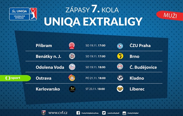 Třemi duely mužské a třemi zápasy ženské UNIQA extraliga dnes pokračuje nejvyšší česká volejbalová soutěž. Diváci mohou zavítat na zajímavý volejbal do Benátek n. J., které přivítají stříbrného medailistu loňského ročníku Volejbal Brno, do Odolene Vody, kde se domácí AERO postaví Českým Budějovicím, i do Příbrami, kam zavítá nečekaně rozjeté ČZU Praha. V ženské části extraligy dojte k repríze loňského semifinále play off mezi Olomoucí a Ostravou, Fénix Brno vyzve v brněnském derby Královo Pole a Šternberk přivítá od 17 hodin Přerov. Přijďte se i Vy podívat na nejlepší tuzemský volejbal!