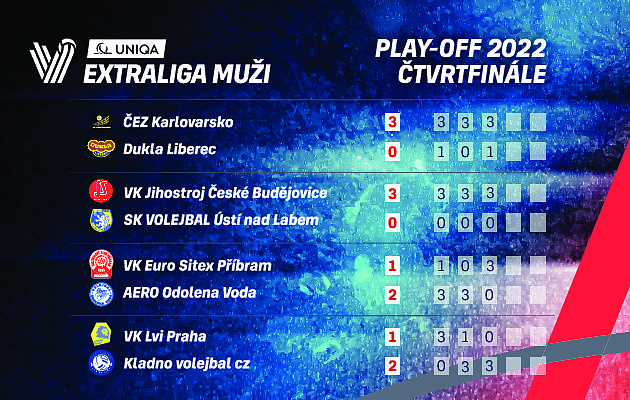 Čtvrtfinále UNIQA volejbalové extraligy mužů 2021/22 pokračuje již pouze na Kladně a v Odoleně Vodě, protože největší favorité na titul ČEZ Karlovarsko a Jihostroj České Budějovice zvládly své čtvrtfinálové zápasy v nejkratším možném termínu, ve třech zápasech a mohou se soustředit na semifinálové boje.