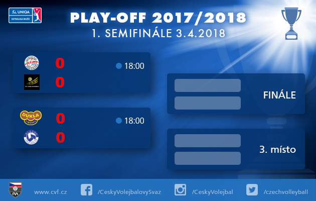 V úterý začínají boje o finálovou účast UNIQA volejbalové extraligy mužů 2017/18. Identické dvojice jako v loňském ročníku rozehrají semifinálové souboje play-off hrané na tři vítězná utkání. Až do soboty si musel tým Českých Budějovic počkat na jméno svého soupeře. Tím se stalo Karlovarsko, jemuž výhra až v pátém souboji s Brnem zajistila postup do nejlepší čtyřky letošního ročníku. Složení druhé semifinálové dvojice bylo známo již dříve - o finále se popere Liberec s Kladnem.