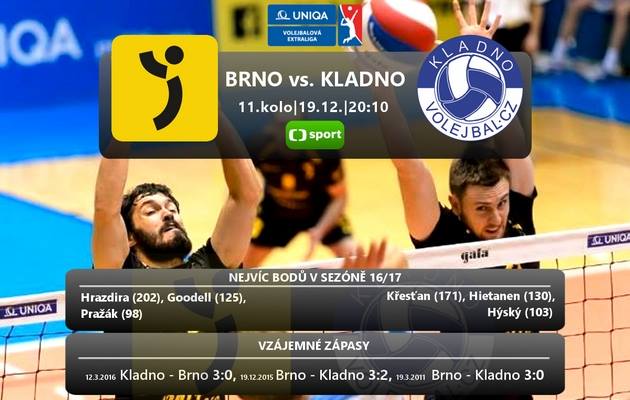 Dohrávka 11. kola nejvyšší české volejbalové soutěže UNIQA extraligy mužů 2016/17 je dnes na programu od 20:10 v Brně. Tam se představí již deset kol neporažené Kladno, v čele s trenérem Milanem Fortuníkem. "Důležité bude nevypadnou z koncentrace," upozorňuje lodivod kladenských volejbalistů Milan Fortuník hned v úvodu. Velký pozor si Středočeši budou muset dávat zejména na třetího nejvíce bodujícího hráče celé UNIQA extraligy Michala Hrazdiru. Ten jen v sobotním zápase proti mistrovskému Liberci zaznamenal 24 bodů a útočil s velmi solidní 61% úspěšností. "Ano, musíme dobře bránit zejména Michala Hrazdiru, právě na tomto hráči stojí hra Brna," přidává svůj postřeh Fortuník. Dohrávané 11.kolo bude v pondělí od 20:10 vysíláno přímým přenosem na programu ČT SPORT. "Věřím, že diváci budou mít na co koukat a že s námi oslaví u obrazovek další výhru,“ zve k televizním obrazovkám trenér Kladna Milan Fortuník.