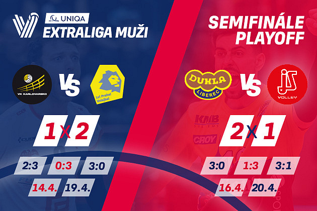 Semifinálová série UNIQA extraligy mužů se pomalu blíží k svému vyvrcholení. Lvy Praha a Duklu Liberec dělí od postupu do finále pouze jedno vítězství. Lépe jsou na tom Lvi, protože ty přivítají Karlovarsko na domácí půdě, naopak Dukla Liberec se bude muset opět popasovat s vyprodanou halou v Českých Budějovicích.
