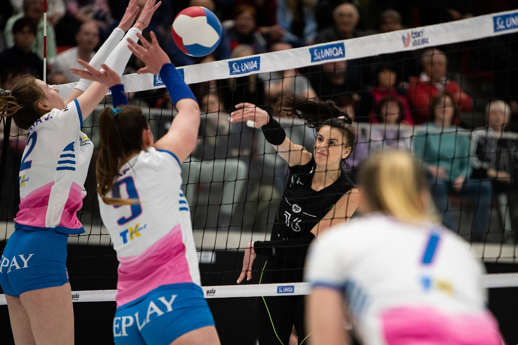 Domácí: Šmídová, Kyrychenko, Marková, Havlíčková, Kozubíková, Širůčková, libero Chevalierová.