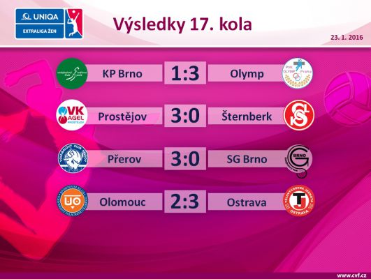 Přímým soubojem o druhé místo v tabulce bylo utkání 17. extraligového kola mezi Univerzitou Palackého Olomouc a Ostravou. Domácí vysokoškolačky, které před zápasem ztrácely na svého soupeře jediný bod, nedokázaly zopakovat výborný výkon z evropského Vyzývacího poháru proti Paříži a po předlouhé, více než dvouapůlhodinové bitvě prohrály 2:3.