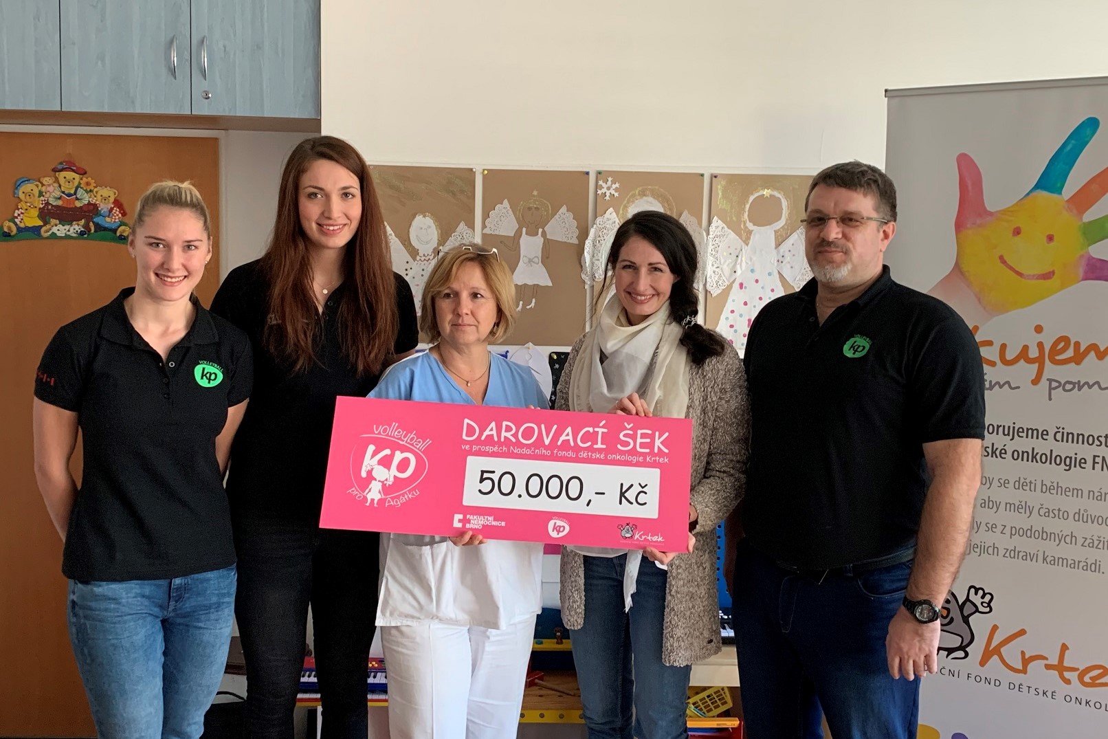 Na začátku tohoto týdne předal Volejbalový klub KP Brno oficiálně šek na 50 000 korun Nadačnímu fondu dětské onkologie Krtek. Stalo se tak v rámci akce KáPéčko pro Agátku, kterou se královopolský volejbalový klub rozhodl podpořit jednak svou nemocnou desetiletou hráčku, a dále Kliniku dětské onkologie při Fakultní nemocnici Brno, kde se Agátka léčí s leukémií.