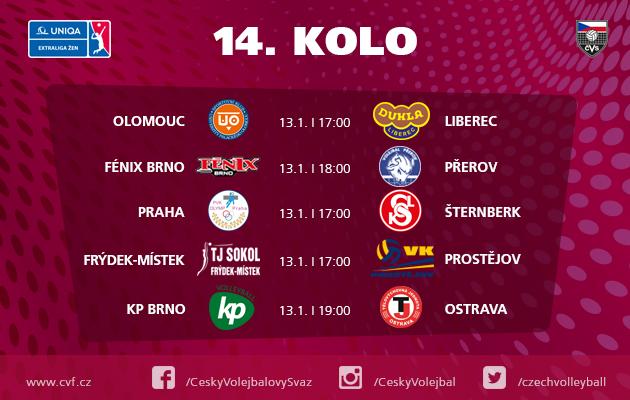 Po pohárové středě přichází v sobotu na řadu kompletní 14. kolo UNIQA volejbalové extraligy žen 2017/18. Souboj úspěšných týmů v pohárové Evropě bude k vidění v Brně. Královo Pole hostí Ostravu. Zajímavý duel se očekává v Olomouci, kde domácí vysokoškolačky přivítají libereckou Duklu. Prostějov, který má tento týden velice nabitý program, zavítá do Frýdku-Místku. Poslední dva zápasy obstarají týmy, které se pohybují okolo postupového osmého místa do play-off a potřebují každý bod. Pražský Olymp vyzve na domácí palubovce Šternberk, který v prvním vzájemném zápase Pražankám jen těsně podlehl. Poprvé v letošním roce se svým divákům představí Fénix v utkání s Přerovem. Kdo se bude radovat z vítězství?