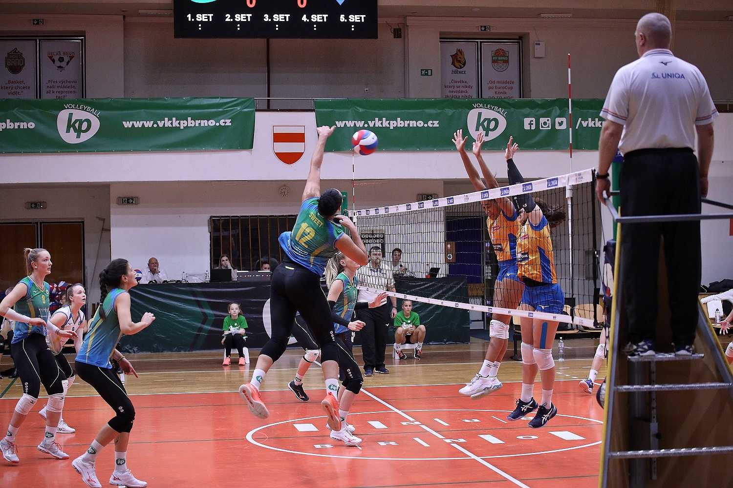 V úvodu utkání se oba týmy dlouho přetahovaly o každý bod (10:10). Zlom nastal při servisu Gretell Moreno Borerro, po jejímž přímém bodu z podání odskočilo KP Brno na 13:11 a vzápětí přidalo bod, což donutilo Martina Hrocha k oddechovému času (14:11). Po něm už domácí hráčky náskok jen navyšovaly (21:15) a set vyhrály s přehledem 25:17.