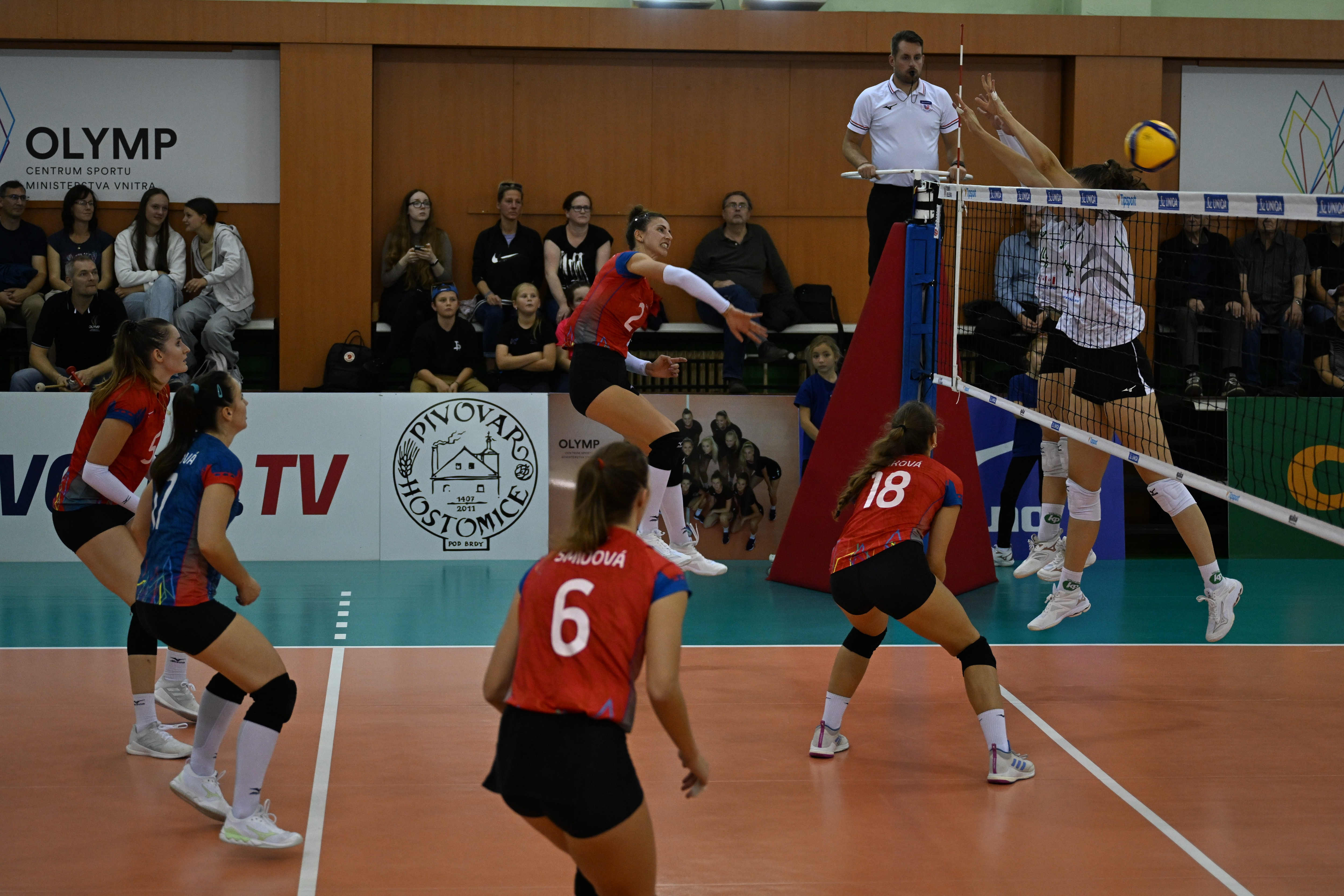 Domácí: Strušková, Dvořáčková, Böhmová, Krejčí, Doshkova, Agbolossou, libero D. Šrámková. Střídaly: Michalčíková, Petrová