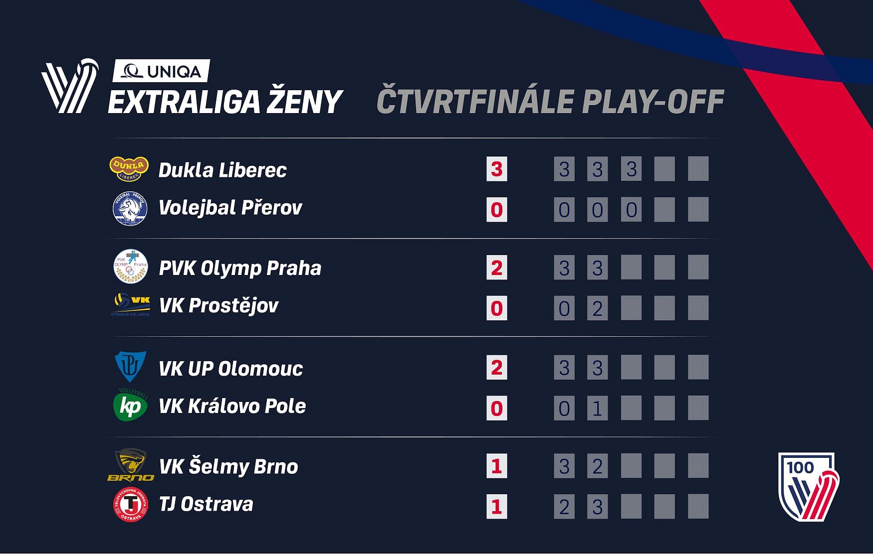 Čtvrtfinále play-off UNIQA volejbalové extraligy žen 2020/21 pokračuje ve čtvrtek dalšími zápasy. Do nich už nezasáhnou volejbalistky Dukly Liberec, které už po třech výhrách nad Přerovem mají jistotu semifinále. K nim se může ve čtvrtek připojit i Olomouc a Olymp, ovšem zbývá udělat poslední krok v nadcházejících domácích zápasech.