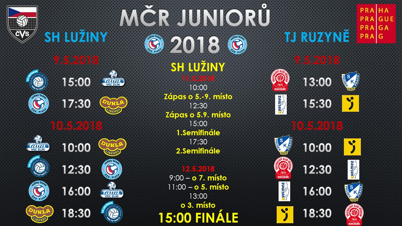 Mistrovství ČR juniorů 2018 dnes odpoledne odstartují první zápasy ve skupinách. V halách na Lužinách a TJ Ruzyně bude bojovat o titul nejlepšího juniorského družstva sezóny 2017/18 osmička týmů, která si účast ve finálovém turnaji vybojovala v juniorské extralize. Dnes a zítra můžete sledovat zápasy ve skupinách, v pátek pak semifinále a zápasy o 5. - 9. místo a v sobotu již finále, zápas o bronz a zápasy o další umístění.
