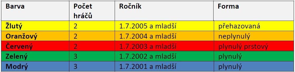 Český barevný minivolejbal je rozdělen do pěti kategorií – barev, což je názorně vyjádřeno v tabulce níže: