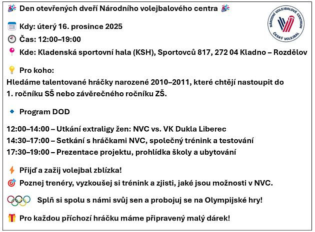 Do nového ročníku 2026–2027 hledáme nové talentované hráčky, které mají ambici posouvat se dál a chtějí se zapojit do profesionální přípravy v rámci NVC. Vybrané zájemkyně rádi pozveme na Den otevřených dveří (DOD), během kterého budou mít možnost zhlédnout naše utkání extraligy žen proti Dukle Liberec, projít si sportovní testování, absolvovat společný trénink s naším realizačním týmem a současnými hráčkami NVC (možnost se s nimi osobně setkat, zeptat se na jejich zkušenosti) a seznámit se s fungováním celého projektu. Tento den jim umožní nahlédnout do každodenního života v centru a získat jasnou představu o tom, co může NVC nabídnout jejich sportovnímu i osobnímu rozvoji.